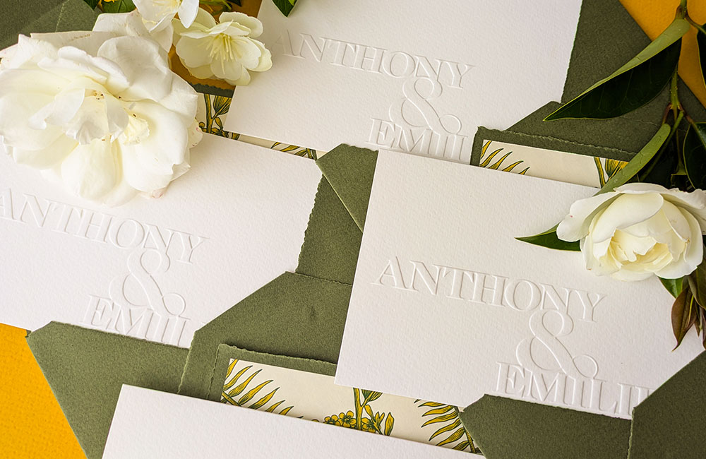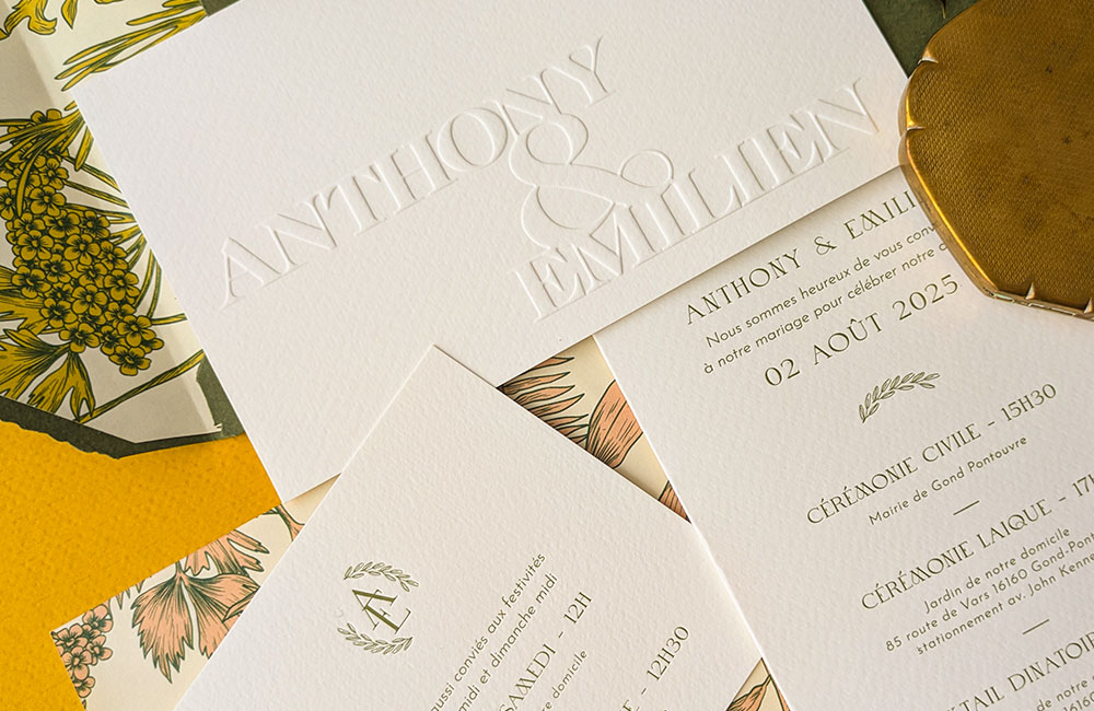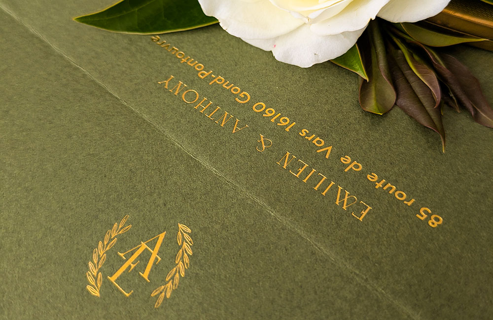 Faire-part de mariage luxe olive en letterpress et gaufrage